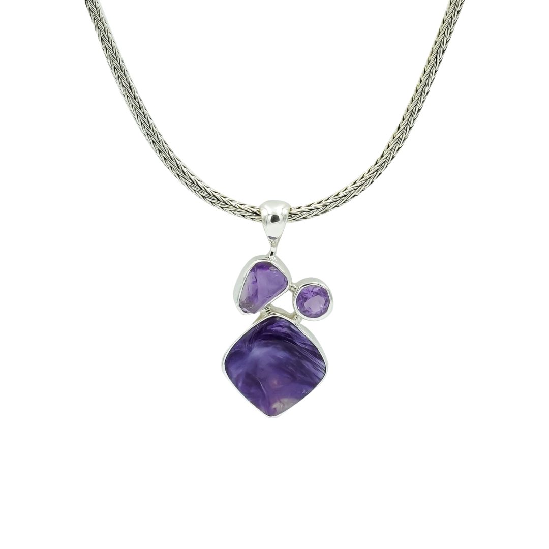 These beautiful Charoite and Amethyst stones are set in fine 925 sterling silver pendant.