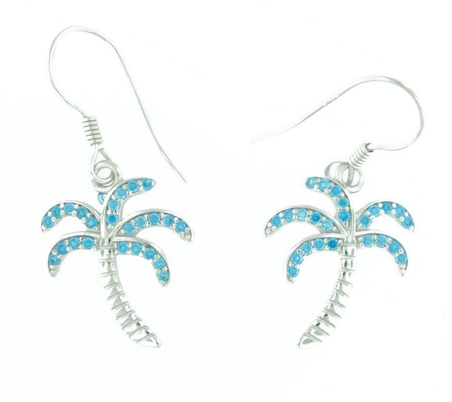 Dangle Blue Topaz Palm Tree Earrings set in .925 Sterling Silver. Earring Hooks in .925 sterling silver. Rhodium overlay to prevent tarnishing.