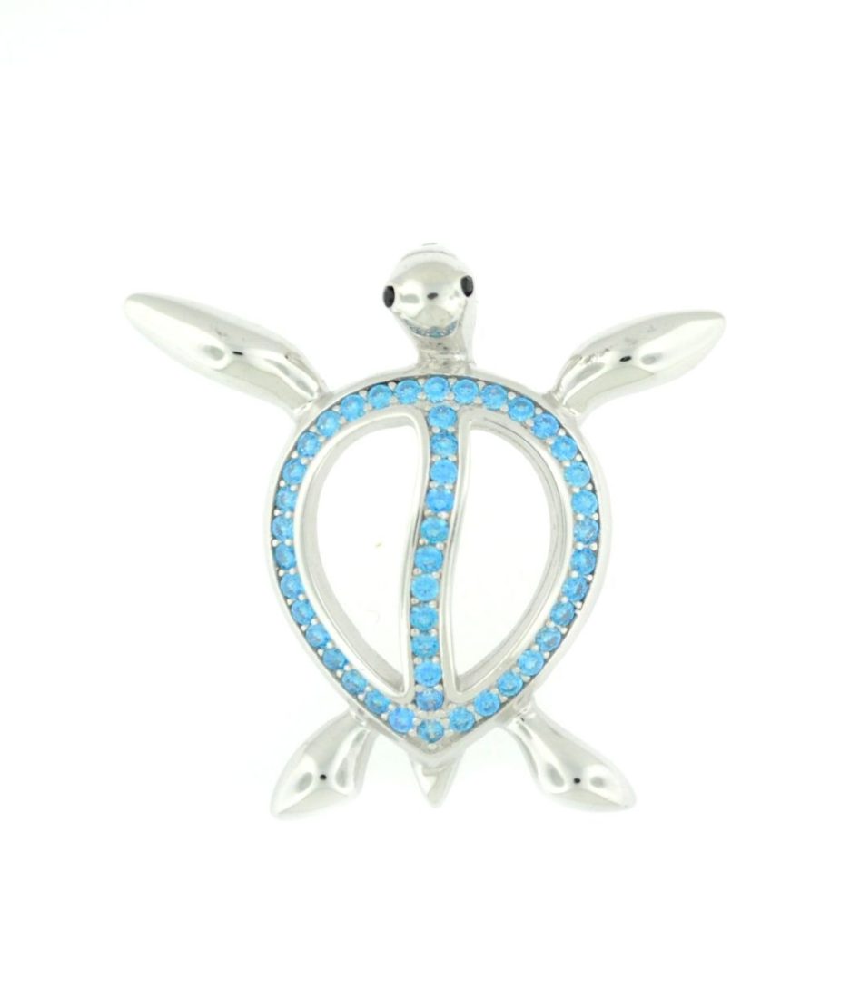 True Blue Baby I love you! Blue Topaz Peace Turtle Necklace created with real gemstones and .925 sterling silver. Includes your choice of a 16 inch, 18 inch or 20 inch necklace. Rhodium overlay to prevent tarnishing. Turtle pendant is 3CM in Length and 2 CM in width.