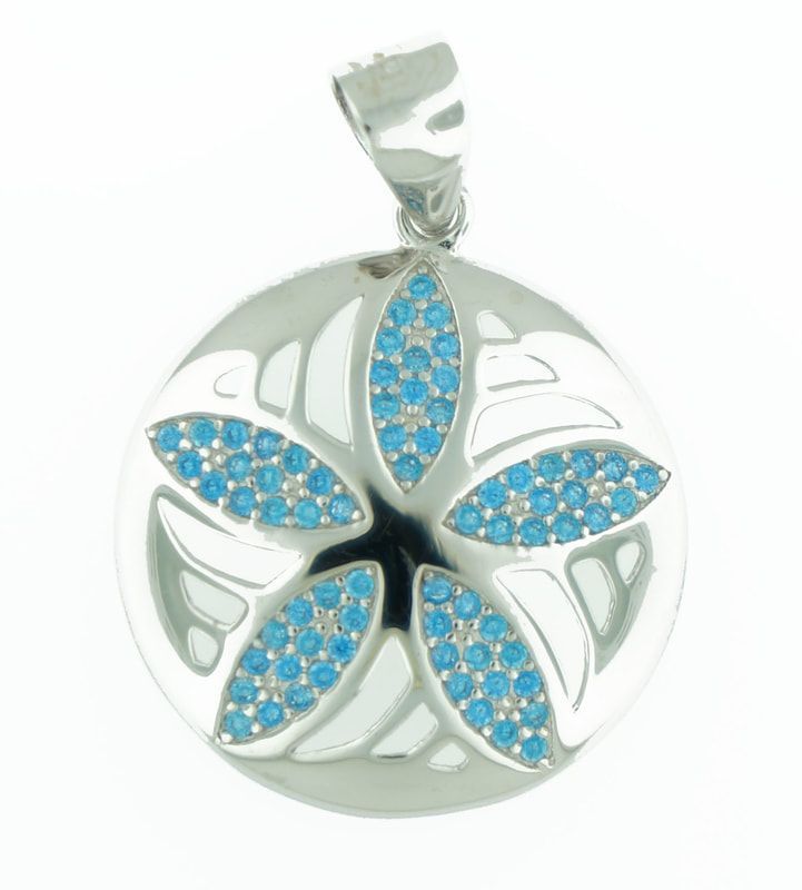 Make a beautiful statement with this sand dollar necklace! Over 75 pieces of genuine Blue Topaz are used to create this Sand Dollar pendant set in .925 sterling silver. Includes a 16 inch, 18 inch or 20 inch necklace. Pendant is 2 cm in length & width. Rhodium overlay to prevent tarnishing.