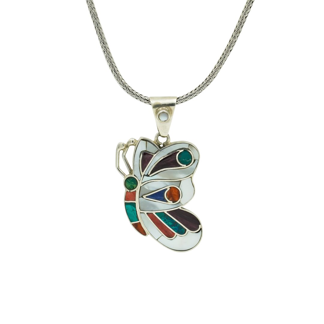 Lovely handmade artisan butterfly pendant set in fine .950 sterling silver. Gemstone inlay in Mother of Pearl, Amethyst, Carnelian and Malachite. *Weave chain is sold separately.