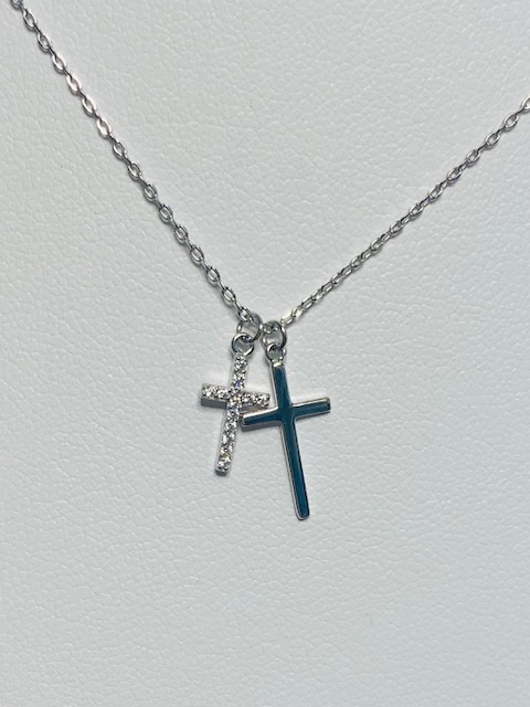 This is the perfect gift item for your loved one who loves dainty jewelry. Double cross necklace is created in .925 sterling silver with a rhodium overlay. Necklace extends from 16 inches to 20 inches.