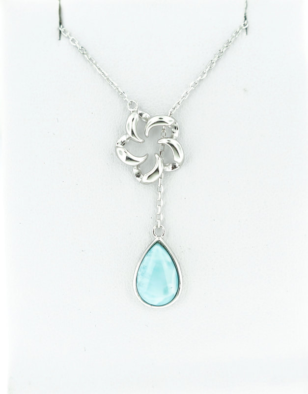 Dangling Teardrop Larimar & .925 Sterling Silver Flower Necklace.  Chain length adjustable 16 inches – 18 inches