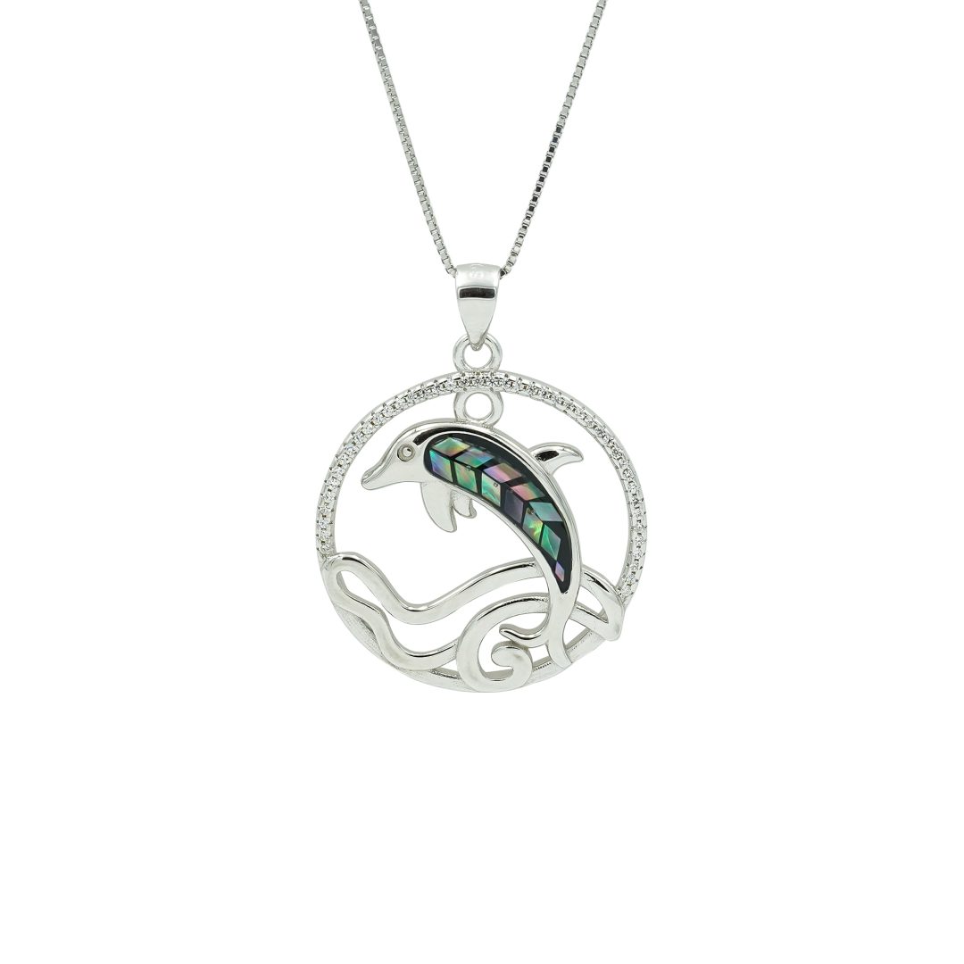 Mosaic Abalone Shell Dolphin Necklace set in .925 Sterling Silver. Rhodium overlay to prevent tarnishing.  Pendant is 1 inch .  Choice of 16 inch, 18 inch and 20 inch chain.