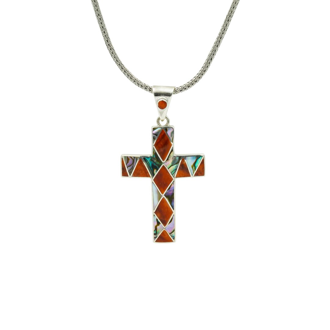 Handmade artisan cross pendant. Set in fine .950 sterling silver with Carnelian and Abalone inlay. Cross is 1 1/2 inches.