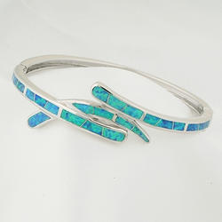 Blue Opal (syn) inlay with .925 Sterling silver. Bangle has hidden secure clasp with safety hook. Bracelet will fit average size wrists. Rhodium plated to prevent tarnishing and scratches.