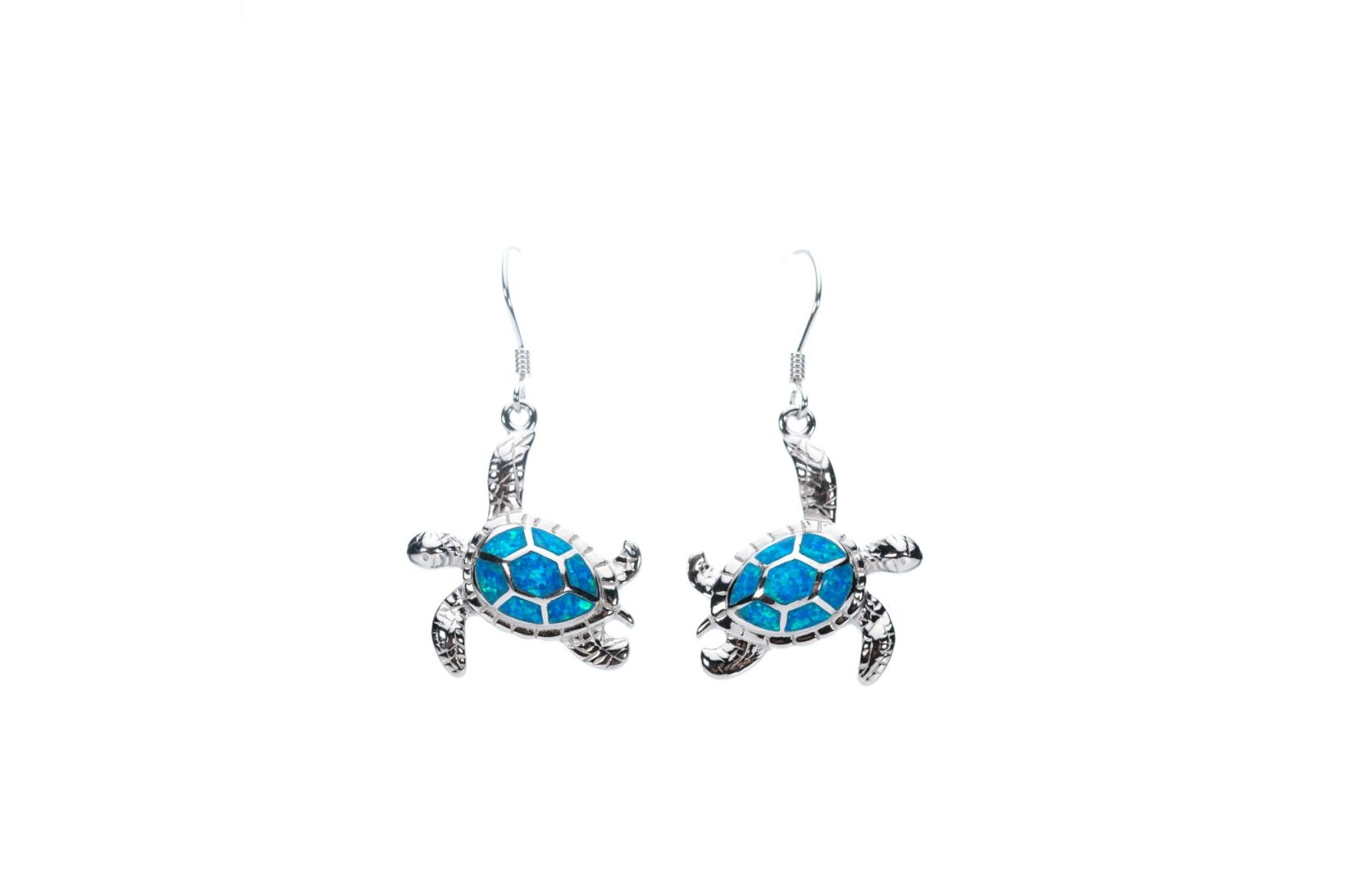 You are stunning wearing these whimsical and alluring Blue Opal (lab created) turtle earrings. Earrings are set in nickel free sterling silver. Hook Earrings. 1 1/4 inch length.