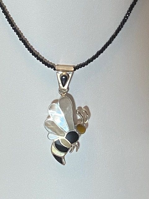 Beautiful Bumble Bee pendant created in .950 Sterling Silver, mother peal and black onyx. Pendant is 1 1/2 inches long.
