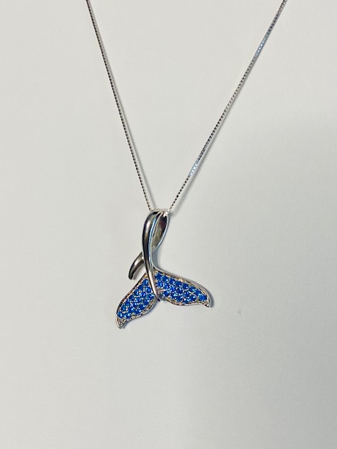This is the perfect piece for the anyone that loves a little bling!  Sterling Silver Whale Tail with blue crystals.  Rhodium overlay to prevent tarnishing.  Includes your choice of 16 inch, 18 inch or 20 inch chain.  Pendant is 1 inch.