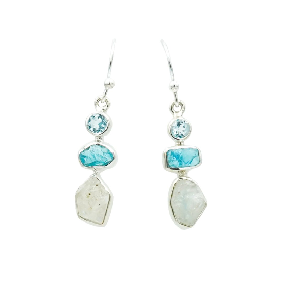 Dangle White Quartz, Blue Topaz and Moonstone set in fine .925 Sterling Silver Earrings. 1 1/2 inches in length. Hook style.